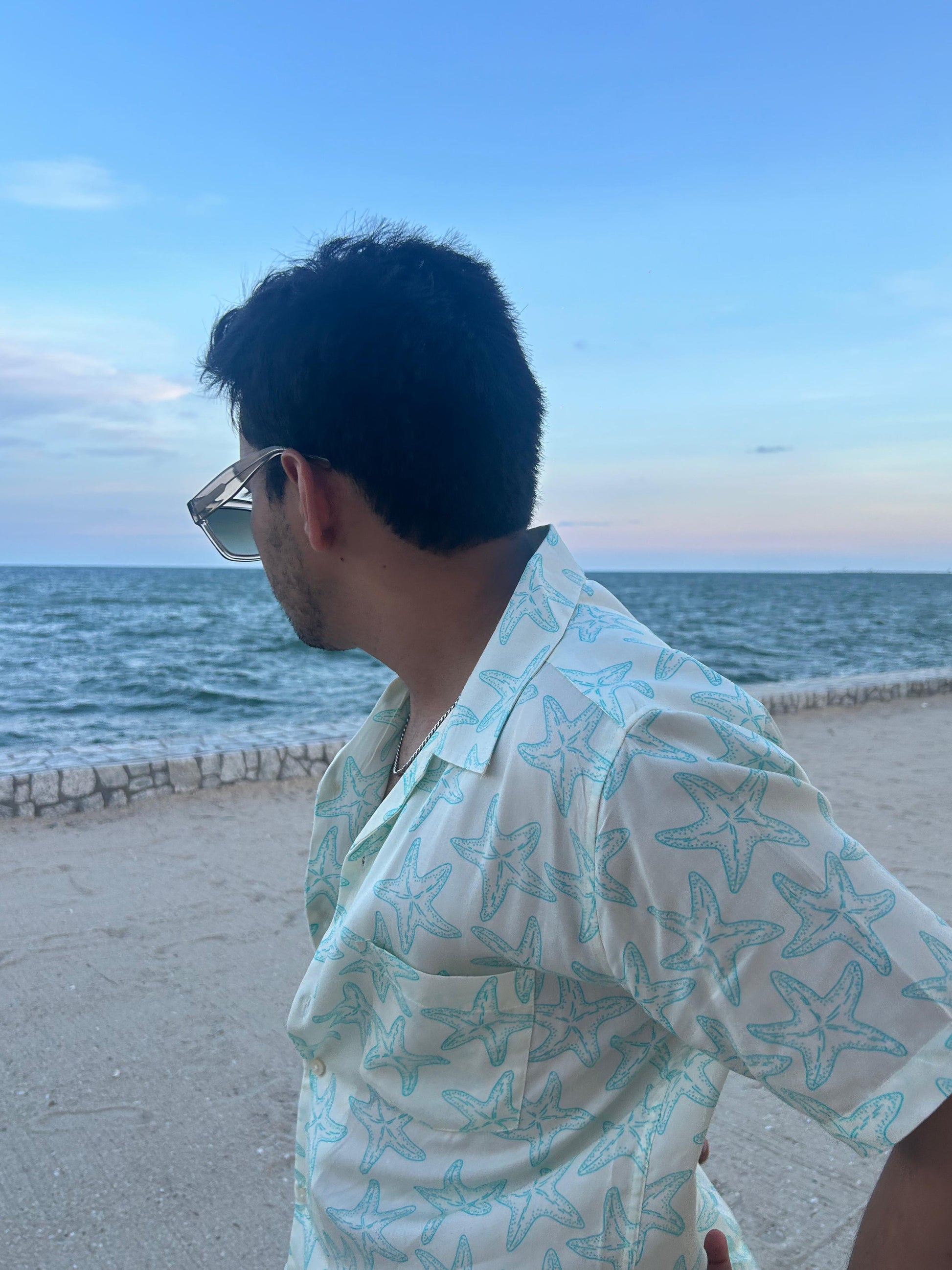 Dive into seaside vibes with the cream starfish printed shirt, perfect for those who love to keep things cool and coastal. Crafted from lightweight, breathable fabric, this shirt features a whimsical starfish print on a creamy backdrop, bringing the ocean’s charm straight to your wardrobe.